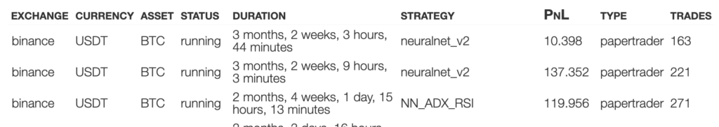 그중에 Geko란 놈을 클론해서 돌려보니까 안되는게 많았다. nodejs 백엔드와 vuejs 프론트엔드 인데, 바이낸스 API 접속부분만 적당히 손봐서 굴려보니까 작동은 되길래 RSI, ADX, 신경망을 결합한 매매전략으로 실험해 보니 제법 수익이 나는 듯하다. 1000달러를 가지고 두세달 돌리니까 10% 이상 수익이 발생했다.
